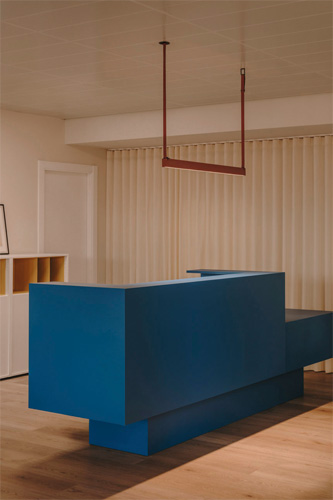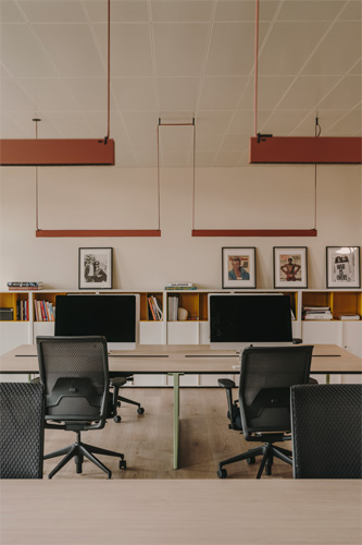 Mit einer Größe von 650 Quadratmetern waren offene Räume, eine gute Belüftung und eine hervorragende natürliche Beleuchtung von vornherein gewährleistet und gesellten sich zum besonderen architektonischen Wert des Gebäudes. Das historische Bauwerk mit seinen charakteristischen Merkmalen wurde im Projekt zur Renovierung und Gestaltung der Büroräume durch eine perfekt ausgewogene Arbeit ergänzt, die einen brutalistischen Industriestil, eine Farbgebung mit auffälligen Primärfarben und eine Aufteilung, die den unterschiedlichen Arbeitsanforderungen gerecht wird, miteinander verknüpft. Als roter Faden dient die Beleuchtung, die die Räume umgibt und sie harmonisch miteinander verbindet.