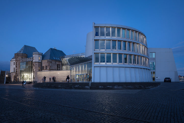 Tagsüber umrahmen die Erweiterungsbauten sichtbar das historische Zollamtsgebäude, das nun in den Abendstunden die Bühne ganz für sich beansprucht. Besonders ausgeprägte Strukturen und Details seiner Fassade treten durch das neue Beleuchtungskonzept von agLicht in den Vordergrund, während sich die Neubauten im Hintergrund zurückhalten. Auf farbiges Licht wurde bewusst verzichtet. Die Lichtdesigner setzten stringent eine warmweiße Lichtfarbe ein.