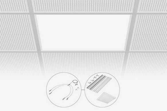 • Decken-Einbaupanel ist in den Formaten 600 × 600, 625 × 625 und 1200 × 300 mm erhältlich.