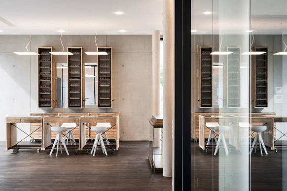 Klare Formen, natürliche Materialien und ein reduziertes Farbkonzept dominieren den Entwurf. In die neuen Räume des Headquarters sollte ein Licht-System integriert werden, dessen Design zum Gestaltungs-Konzept von Andy Wolf passt und zugleich Arbeitsplätze und Showroom in tageslichtähnlicher Qualität erhellt. Ziel war es, zugleich die Farben der Brillen in Szene zu setzen und optimale Bedingungen für die Produktion zu schaffen.