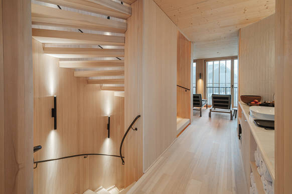 Einen wesentlichen Beitrag zur Atmosphäre des Badehauses leistet die Lichtplanung von ARCHILUM unter der Leitung von Barbara Gilhaus-Sturn. Für sie ist Licht mehr als Funktion – „Licht ist Poesie“. Ziel war es, die wohltuende Wirkung natürlichen Lichts auch in innenliegenden, dunkleren Bereichen spürbar zu machen. „Ich orientiere mich am Tageslichtverlauf – ich schaue der Natur ihr Phänomen ab“, beschreibt sie ihren Ansatz. Übertragen auf künstliches Licht heißt das: tagsüber höhere Lichtniveaus, welche die Räume öffnen und weniger „höhlenartig“ wirken lassen, und gegen Abend ein gedimmtes, zunehmend warmes Licht. Möglich wird dies durch manuell eingesetzte Dim-to-Warm-Leuchten, deren Lichtfarbe sich beim Dimmen zum Warmen hin verändert – ähnlich dem Verlauf des Tageslichts vom Mittag bis zum Abend. Barbara Gilhaus-Sturn ist überzeugt: „Wir tragen diese warmen Abendstimmungen tief in uns, so wie die Erinnerung an ein Lagerfeuer.“ Auf diese Weise begleitet das Licht im Hotel Hirschen den Rhythmus des Tages, betont die handwerkliche Qualität der Holzarchitektur und schafft genau jene Atmosphäre, auf die das Hotel großen Wert legt.