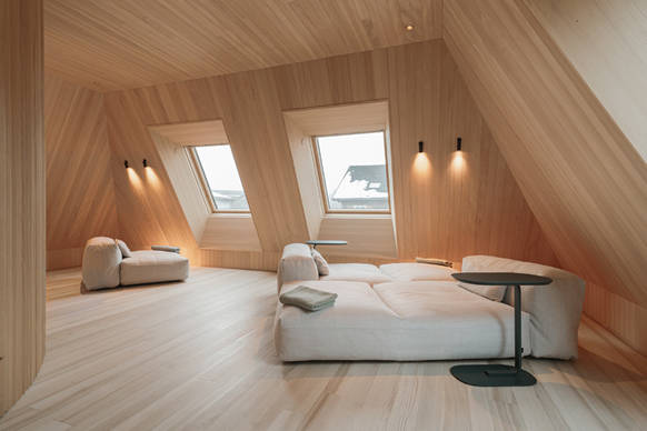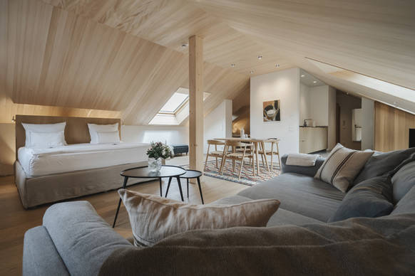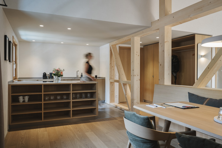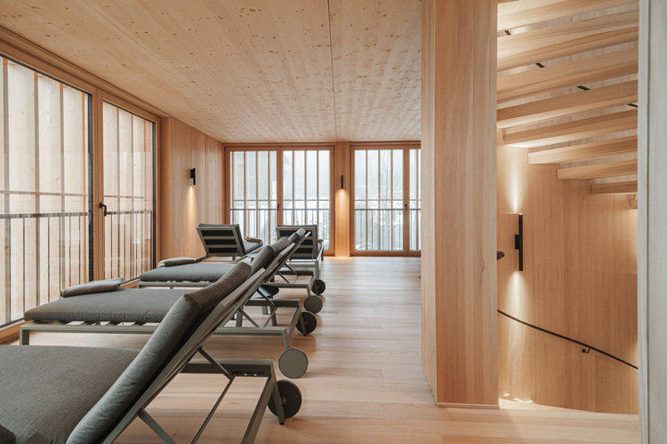 Mit seiner sonnengezeichneten Fassade prägt das Stammhaus den Dorfplatz, während das Wälderhaus großzügige Apartment-Suiten bietet. Der 2024 fertiggestellte Neubau des Badehauses, geplant vom Architekturbüro NONA aus Bezau, stellt eine gelungene architektonische Ergänzung dar. Mit seiner markanten Dachform, angelehnt an die traditionelle Walmform, und dem feingliedrigen Holzkleid mit beweglichen Lamellen fügt sich das Gebäude harmonisch in die dichte historische Nachbarschaft ein. Es erweitert das Hotelangebot um eine hochwertige SPA- und Wellness-Oase mit lichtdurchfluteten Ruhezonen, Sauna, Massageräumen und Gartenbereich – ein stiller Ort des Rückzugs, der zugleich die Sprache der regionalen Architektur neu interpretiert.