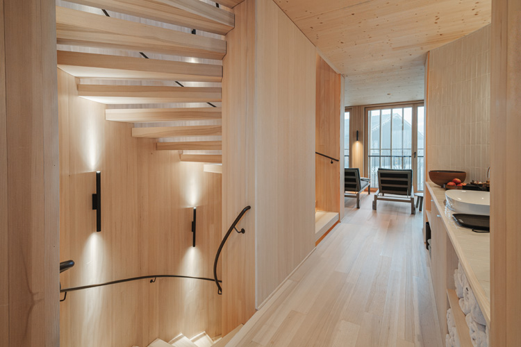 „Mit dem Badehaus wollten wir keinen lauten Effektbau schaffen, sondern einen stillen, zeitgenössischen Ort, der sich selbstverständlich in unser Ensemble einfügt“, erläutert Inhaber Peter Fetz sein Herzensprojekt. Auch die Lichtplanung und die Wahl der Leuchten spielten eine wichtige Rolle. „Sie übertragen die Idee von Ruhe, Handwerk und regionaler Verankerung gewissermaßen in eine räumliche Erfahrung für die Gäste“, wie der passionierte Bauherr betont.