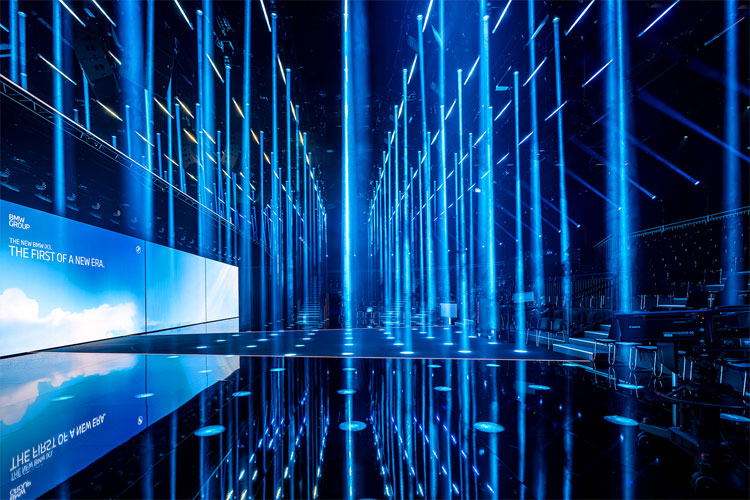 Diese doppelte Spiegelung verstärkte auch die Beam-Architektur während der Präsentation. In Kombination mit dem hochglänzenden Boden und perfekt abgestimmtem Videocontent entstand eine immersive Lichtwelt, die den technologischen Anspruch und die futuristische Designsprache von BMW eindrucksvoll unterstrich.