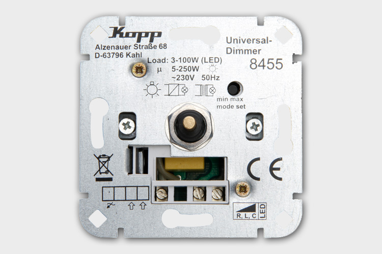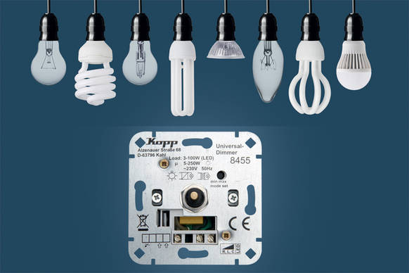Die perfekte Lösung für dieses Problem bietet Kopp jetzt mit zwei neuen Unterputz-Universaldimmern (R, L, C). Denn diese sind nicht nur mit unterschiedlichen Leuchtkörpern kompatibel, sondern auch für unterschiedliche Lasten einsetzbar. Beide Universaldimmer dimmen LED-Lampen von 3 bis 100 Watt und Glühlampen von 5 bis 250 Watt stufenlos und sorgen so für das perfekte Licht für jeden Bedarf. Einziger Unterschied: Während sich der eine Universaldimmer (Art.-Nr. 845500188) als 2-Draht-Gerät für eine Schaltstelle eignet, ist der andere (Art.-Nr. 845500181) als 3-Draht-Gerät auch als Nebenstelle einsetzbar.