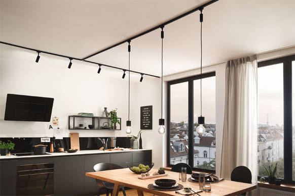Ein flaches LED-Panel verbreitet flächiges, blendfreies Raumlicht für eine angenehme Grundbeleuchtung. Für einen ausgeleuchteten Esstisch sorgen Pendelleuchten, die sich ganz leicht mit dem schwarzen Pendel-Adapter in das URail-System einfügen. Auch die beliebten und bereits aus dem URail-Sortiment bekannten DecoSystems- und 2Easy-Basis-Pendel lassen sich mit ihrer Vielzahl von Metall-, Glas oder Stoffschirmen leicht in die schwarze Edition integrieren.