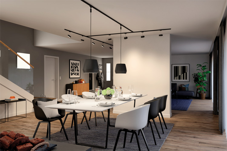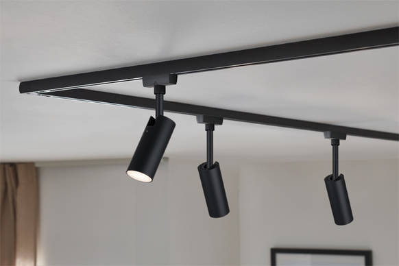 Die Schiene für jede Beleuchtungssituation - Das URail-Schienensystem für die Zimmerdecke bringt mit nur einem Stromauslass Licht dorthin, wo es gebraucht wird. „Dadurch lassen sich verschiedene Bereiche innerhalb eines Raumes ganz individuell beleuchten: Von eng gebündelten Spots für Bilder und Regale bis zur Pendelleuchte über dem Esstisch“, erklärt Tobias Schramm, Produktmanager beim Hersteller Paulmann Licht.