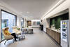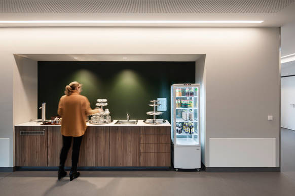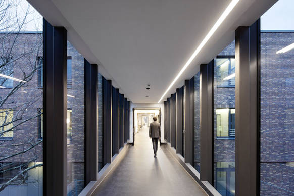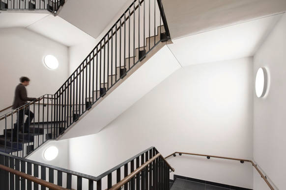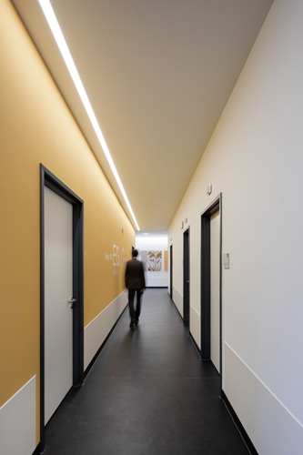 Das Licht ist vernetzt – durch LITECOM infinity. Das Lichtmanagementsystem von Zumtobel übernimmt die zentrale Steuerung aller Leuchten im öffentlichen Bereich des Gebäudes. Dank integrierter Sensoren reagiert die Beleuchtung auf Präsenz und nimmt zudem die Dynamik des Tageslichts auf. So unterstützt sie den natürlichen Biorhythmus des Menschen und gewährleistet maximalen Sehkomfort.