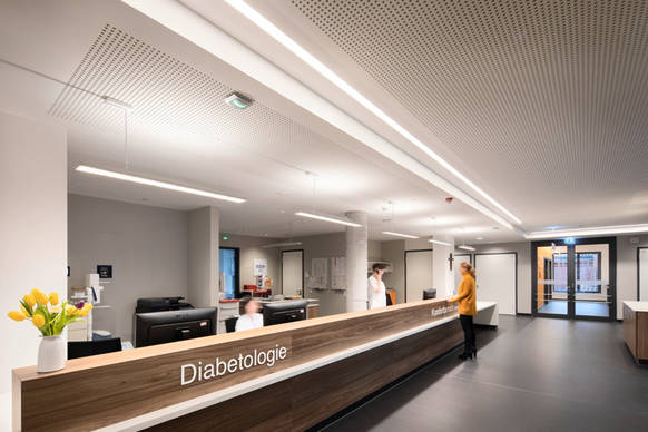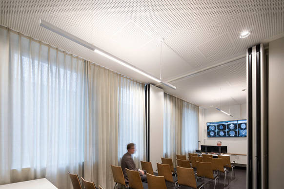 Im Untersuchungszimmer wartet in der Zwischenzeit der erste Patient. Der Arzt kann dort das Licht optimal einstellen, es an die jeweilige Situation anpassen und so die Untersuchung durchführen. Die professionelle Beleuchtung in den Behandlungsräumen unterstützt gutes Sehen – und ermöglicht damit optimale Arbeitsbedingungen. Die Leuchte LIGHT FIELDS sorgt dabei für blendfreies Licht in minimalistischem Design – perfekt auf die sensiblen Untersuchungs- und Behandlungsbereiche des Klinikums, und die Sehanforderungen des Personals zugeschnitten.