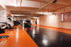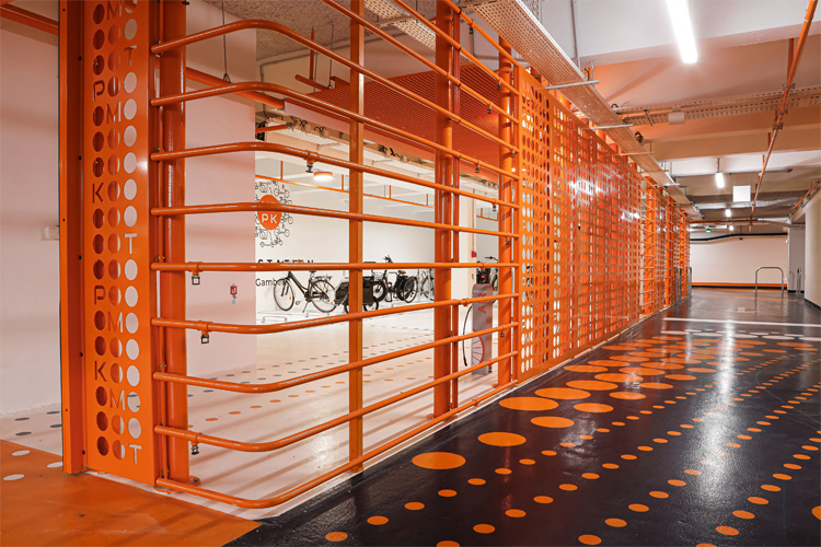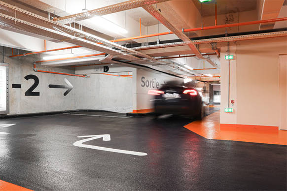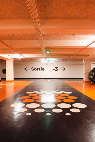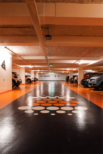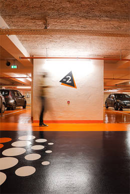 Aber auch auf den tieferen, für Autos vorgesehen Ebenen sind die Veränderungen nicht zu übersehen. „Wir haben die Zahl der Stellplätze auf den drei Ebenen um 10 % auf 438 reduziert,“ erklärt Nicolas Andreotti, Geschäftsführer von METPARK: „Diese haben wir dafür um 10 cm auf 2,40 m verbreitert.“ Einfahrt und Bezahlung erfolgen ticketlos via Kennzeichen-Erkennung, Displays zeigen die Verfügbarkeit in Echtzeit an und ein Leitsystem führt mit grünen und roten Lichtsignalen zu freien Plätzen. Für Elektrofahrzeuge stehen über 100 Ladestationen bereit. Ökologische Aspekte standen beim gesamten Umbau ganz oben auf der Agenda: Vom Recycling der Farbeimer im Bauprozess bis zur Kreislauf- und Rückbaufähigkeit aller Einbauten, um auf Entwicklungen der innerstädtischen Mobilität zukünftig flexibel reagieren zu können.