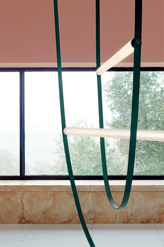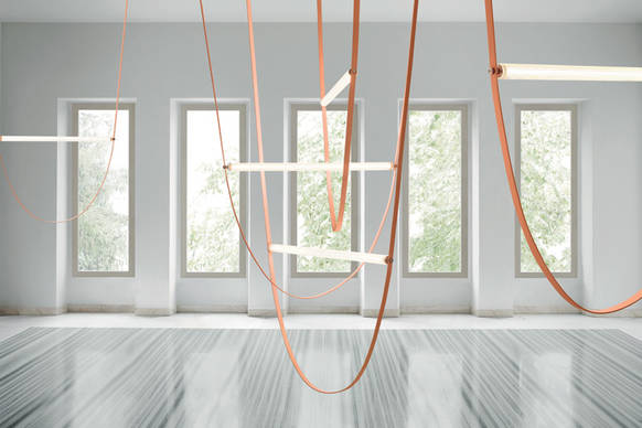 Das abgeflachte, gürtelähnliche Soft-Touch-Gummiband mit integrierter Stromzuführung wird in den Farben Pink und Forest Green angeboten. Seine Länge kann je nach Deckenhöhe von ca. zwei bis acht Meter variiert werden. Für die Fixierung der gerippten Borosilikatglas-Röhre sorgen zwei formschöne, satinierte Edelstahlelemente, wovon eines die elektrischen Komponenten aufnimmt. Die Befestigung an der Decke erfolgt über zwei Deckenrosetten aus Polycarbonat. Mit der in der Rosette integrierten Elektronik können verschiedene Dimmersysteme (Push, 1-10V, Potentiometer, DALI) verwendet werden. Als Lichtquelle kommt ein dimmbares 45W LED-Modul mit 2793 lm, 2700 K und CRI90 zum Einsatz.