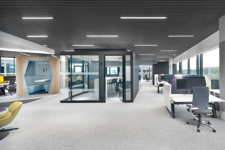 Bei der neuen Konzernzentrale der Continental AG in Hannover war die Beleuchtung bereits in einem sehr frühen Projektstadium ein wichtiger Bestandteil der Planung. So konnten die anspruchsvollen Vorgaben an die Akustik und die Flexibilität bei der Verlegung der akustisch wirksamen Lamellendecke von HAUFE Deckensysteme, mit integrierten Zumtobel SUPERSYSTEM inline Leuchten gewährleistet werden. Im Bereich der Arbeitswelten fügen sich die eleganten Lichtlinien perfekt in die schmalen Abstände zwischen den Akustiklamellen ein. Diese sind nicht nur werkzeuglos installiert, sondern verbinden sich auf einfache Weise mit den mikroperforierten Lamellen der Decke, ohne dass eine zusätzliche Abhängung an die Rohdecke benötigt wird.