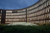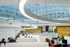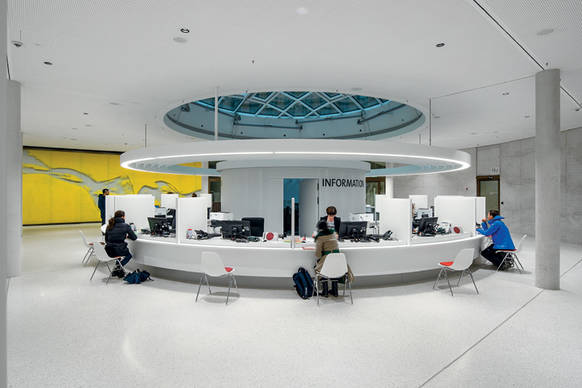 Vom Rathaus-Vorplatz gelangen die täglich rund 1000 Besucher über einen Windfang direkt ins Bürgerservicezentrum. Hier können sie amtliche Dokumente beantragen und andere Dienstleistungen der Stadtverwaltung in Anspruch nehmen. Nicht etwa im Umfeld von fensterlosen Fluren mit Einzelbüros. Nein, in einer weitläufigen, lichtdurchfluteten Halle in elegantem Weiß, die die ganze Fläche des ovalen Innenhofs einnimmt. Unwillkürlich hebt sich ihr Blick zunächst nach oben zu den großen runden Glas-Oberlichtkuppeln, hin zur Holzfassade der fünf Bürogeschosse und zum Himmel über Freiburg. Erst dann schweift der Blick auf die vier runden Serviceinseln.