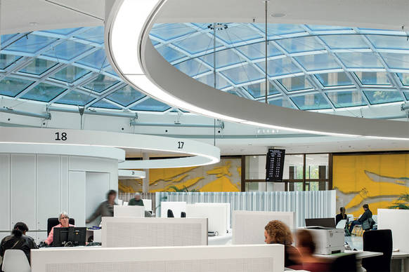 Jede dieser „Rotunden“ mit rund 10 m Durchmesser besteht aus einem mittigen Zylinder, in dem sich ein Rückzugsraum befindet. Mit kreisförmig angeordneten Beratungsplätzen darum herum. Darüber jeweils ein von der Decke abgehängter, filigraner Beleuchtungsring, der die Rotunde als Lichtinsel in der Halle inszeniert. Zugleich ermöglicht er es, die Arbeitsplätze ohne zusätzliche Leuchten zu belichten. Aufgabe von Zumtobel war es, mit Planern und Fries Innenausbau, dem Hersteller der als Einbaumöbel konzipierten Rotunden, eine Lichtlösung zu entwickeln, die neben atmosphärischen Anforderungen zahlreiche weitere Ziele zu erfüllen hatte.
