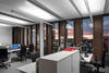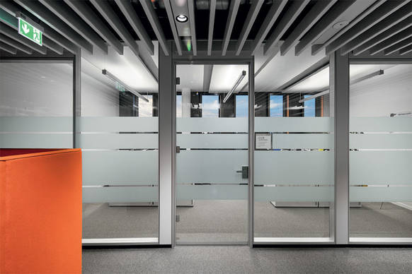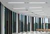 Eine weitere Vorgabe war die Montage der Leuchten mittig auf den Achsen des Bürorasters. Mit der Konsequenz, dass zur optimalen Unterstützung der Sehaufgaben in zweiachsigen Büros lediglich eine Leuchte zur Verfügung steht. Als Antwort auf diese Herausforderung entwickelte Zumtobel auf Grundlage der Leuchte LINCOR eine 3 m lange Leuchte mit einem extrem schlanken Querschnitt von 63 x 64 mm und einer dennoch sehr hohen Lichtleistung von insgesamt 11.000 Lumen. Für exzellentes Licht sorgen die ideal festgelegte Farbtemperatur von 4000 Kelvin und die Entblendung mithilfe einer Minizellenstruktur. Maßgeblich ist aber auch das Verhältnis von direkt auf den Arbeitsplatz zu indirekt an die Decke gerichtetem Licht von 70/30. Für mehr Komfort und Energieeffizienz am Arbeitsplatz sind in den Leuchten Helligkeits- und Bewegungssensoren integriert. Die Beleuchtungsstärke wird permanent so angepasst, dass die auf dem Schreibtisch erforderliche Beleuchtungsstärke von 500 Lux erreicht wird. Ist kein Mitarbeiter im Büro, schaltet sich das Licht aus.