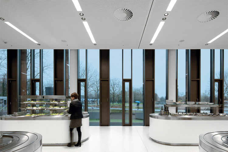 Zur Mittagszeit steht den im Rathaus arbeitenden Menschen das Mitarbeiterrestaurant im Erdgeschoss zur Verfügung – eine große offene Fläche ganz in Weiß, die an das Design des Bürgerservicezentrums anknüpft. Die klare Gestaltung sorgt für einen übersichtlichen Raum, in dem die mit vertikalen Farbstreifen strukturierte Innenwand und die Holzstühle das Gefühl von Wärme entstehen lassen. Für die flächenbündig in die Decke integrierten prismatischen Einbau-Sonderleuchten von Zumtobel gelten gleich hohe Gestaltungs-, Qualitäts- und Energieeffizienz-Standards wie in den restlichen Arbeitsbereichen. Eine besondere Rolle spielt hier der hohe Farbwiedergabeindex (CRI) > 90, der die Speisen auf den Tellern farbecht und appetitlich ins rechte Licht rückt.