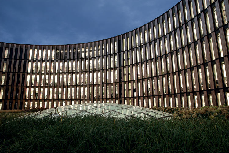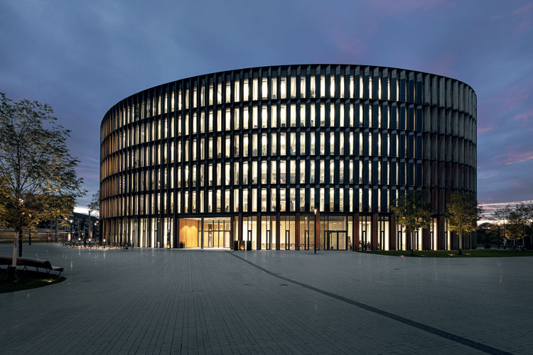 Ein sechsgeschossiger Baukörper. Hinter großen Platanen. Doch was den Rathausbesuchern sofort ins Auge sticht, ist seine Form. Seine organische Ovalform macht neugierig. Nähern wir uns ihm weiter an, wird eine Glasfassade mit umlaufend geschosshohen Lamellen sichtbar. Rückseitig aus hellem Lärchenholz, vorderseitig vollflächig als Photovoltaik-Paneel genutzt, sorgen diese Lamellen für ein feingliedriges Erscheinungsbild. Zugleich sind sie Symbol für die wesentlichen Charakteristika des neuen Freiburger Rathauses: die elegante sowie funktionale Gestaltung und die zukunftsweisende Energieeffizienz nach einem Konzept von Generalfachplaner DS Plan.